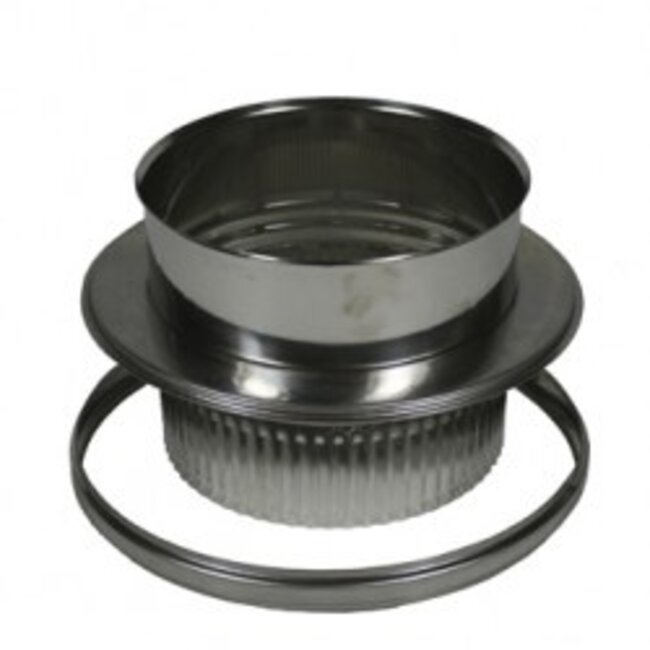 Dubbelwandige aansluitstuk ondermet krimprand, ø 130 / 150 mm 30 mm isolatie. Let op: Klemband en klemsluiting inbegrepen.